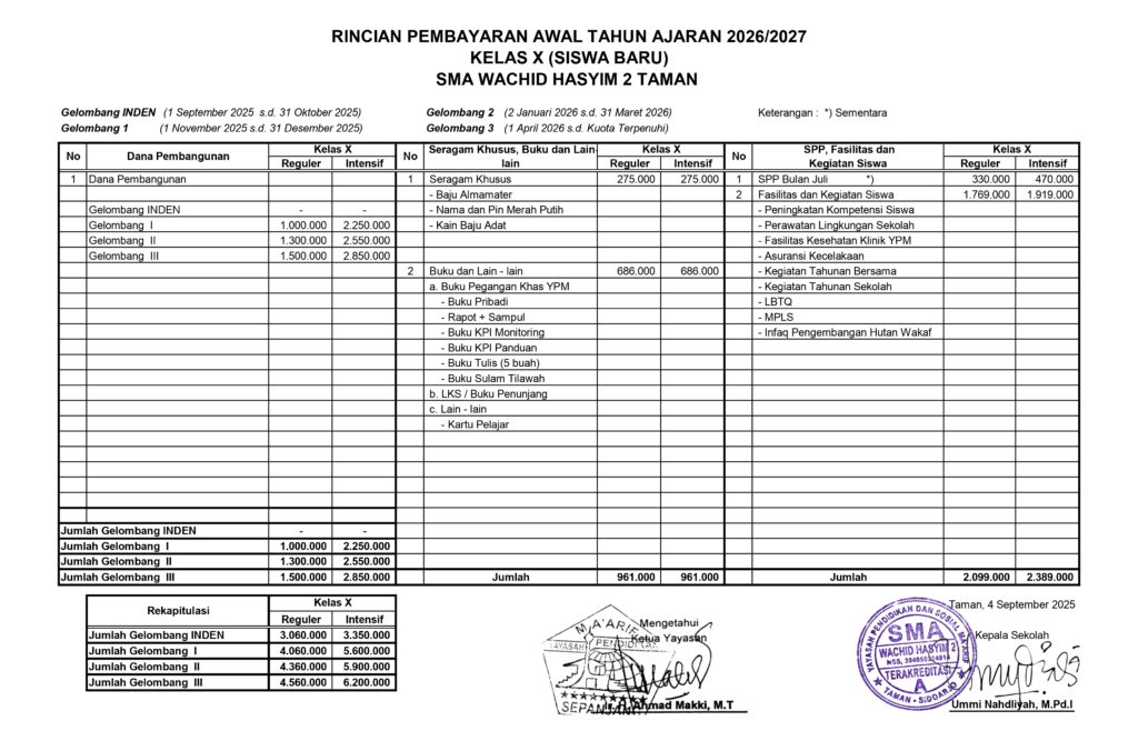 *biaya di atas belum termasuk formulir (Rp. 250.000) dan seragam